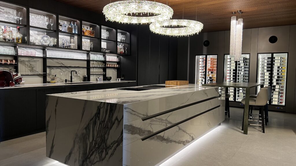 Cette cuisine design luxueuse allie élégance, fonctionnalité et éléments naturels. L’îlot central est recouvert de grès cérame grand format à l’aspect marbre raffiné. Les armoires hautes foncées à structure bois créent un contraste élégant. Le concept d’éclairage avec des luminaires en cristal suspendus au-dessus de l’îlot et des éléments végétaux et en verre servant de séparateurs d’espace constitue un atout particulier. Une cuisine sur mesure réalisée par un menuisier a permis une planification précise, personnalisée et de grande qualité. Le résultat : une cuisine ouverte et confortable avec un coin bar, des équipements intégrés et une atmosphère unique. Un lieu dédié au plaisir, à la communication et à un style de vie raffiné.