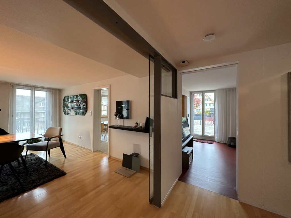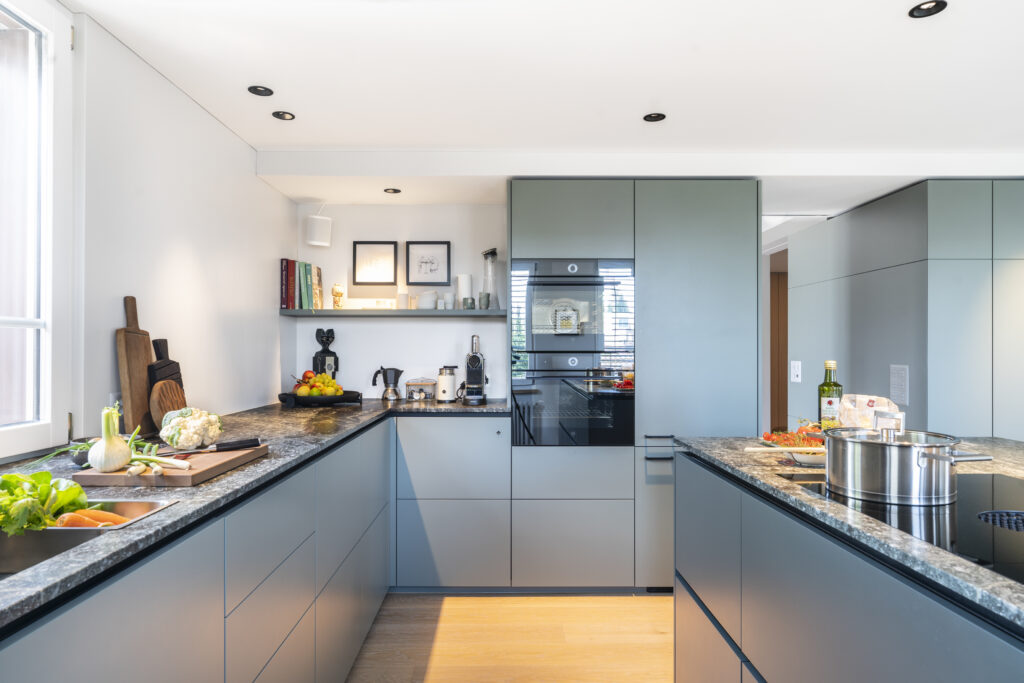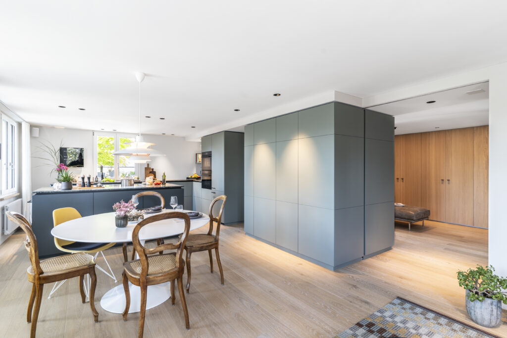 Avec ses différents niveaux de sol et de plafond ainsi que ses défis statiques, cette maison à colombages vieille de près de 200 ans posait des exigences élevées en matière de rénovation. La propriétaire, également architecte d’intérieur, a créé un espace de vie ouvert et moderne dans lequel la cuisine sert de zone de rencontre centrale. Des portes coulissantes permettent de moduler l’ambiance de la pièce et créent des transitions fluides entre espace et intimité. La cuisine est restée à son emplacement d’origine, mais a été enrichie d’un îlot. La suppression des cloisons a permis de créer un plan d’étage ouvert qui met en valeur le cœur du projet : un cube central qui relie plusieurs pièces entre elles. Ce cube offre un espace de rangement généreux, intègre de manière raffinée des portes coulissantes et des prises électriques et cache deux piliers nécessaires à la statique. AXIS montre de manière impressionnante comment un concept d’espace soigneusement planifié dans un bâtiment historique peut créer une qualité de vie moderne et une valeur ajoutée fonctionnelle.