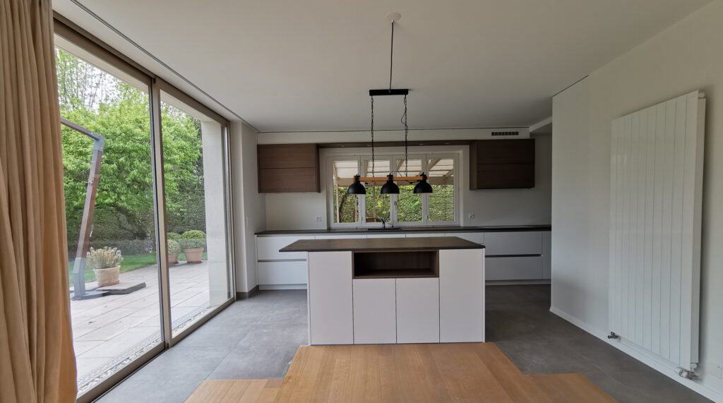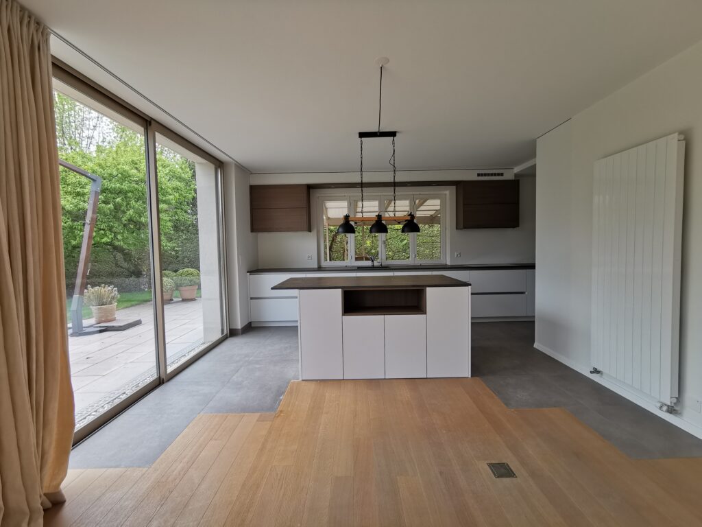 Dans le cadre de cette rénovation, nous avons entrepris une transformation complète de la cuisine pour lui donner un style plus moderne et fonctionnel. Afin d’optimiser l’espace et d’apporter plus de luminosité, nous avons supprimé le mur de séparation entre la cuisine et le séjour. Cette ouverture a permis de repenser totalement l’aménagement, en intégrant la nouvelle cuisine directement dans l’espace de vie. Un îlot central a été installé dans la partie séjour, offrant à la fois un espace de préparation, de rangement et de convivialité. Enfin, pour assurer une parfaite continuité entre les deux espaces, une rectification du parquet a été réalisée. Cette étape a permis d’harmoniser le sol et de créer une transition fluide entre l’ancienne zone du séjour et la nouvelle implantation de la cuisine. Grâce à ces travaux, la cuisine s’intègre désormais naturellement au séjour, offrant un cadre moderne, spacieux et agréable à vivre au quotidien.