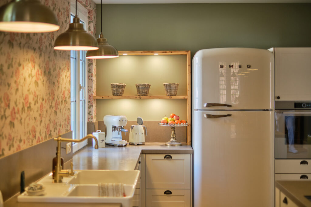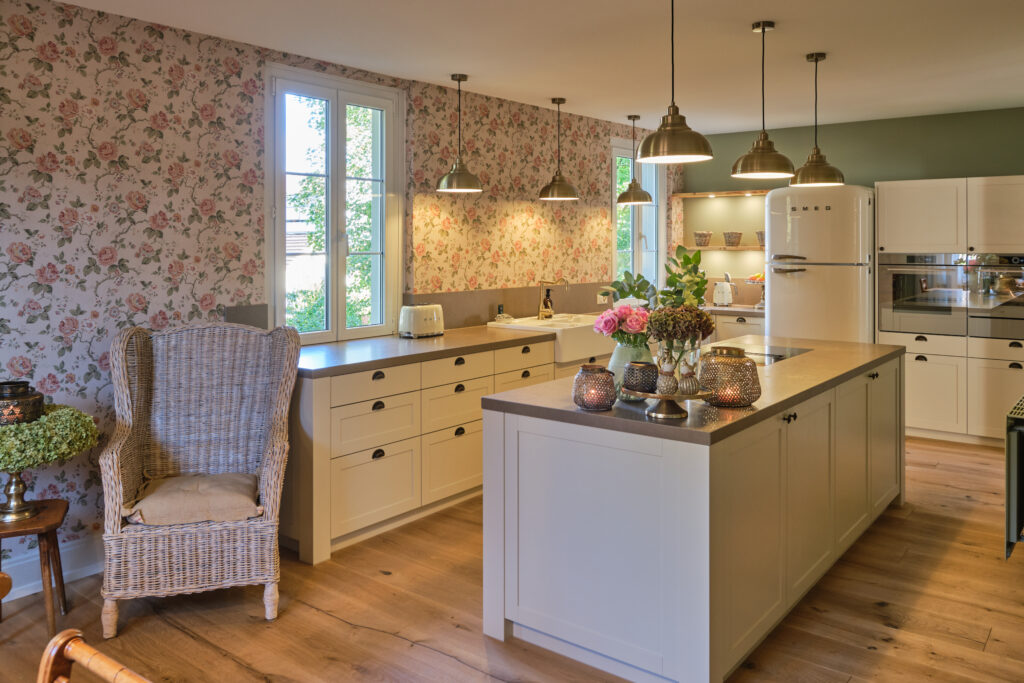 Le projet Haus am Bach vit de la connexion entre la nature et l’homme. Le bâtiment vieux d’environ 150 ans, autrefois une sellerie, a été rénové avec sensibilité et respect pour devenir un lieu harmonieux. La cuisine ouverte au premier étage en est le cœur. Sa forme et sa couleur lui confèrent une atmosphère chaleureuse, tandis que le revêtement en céramique crée des contrastes intéressants. Un papier peint avec un motif naturel reflète l’environnement à l’intérieur. Le lavabo en céramique encastré dans le plan de travail, fièrement orné d’une robinetterie en bronze doré, constitue un élément particulièrement remarquable. Les façades avec cadres en bois et les colonnes de l’îlot de cuisine incarnent le style classique des maisons de campagne. La fine peinture à la main fascine par ses jeux de lumière changeants. Des détails harmonisés avec soin, tels que les poignées en forme de coquillage, des équipements de haute qualité et des solutions individuelles, garantissent fonctionnalité et confort. Cette cuisine sur mesure crée une ambiance pleine de personnalité dans la maison au bord du ruisseau.