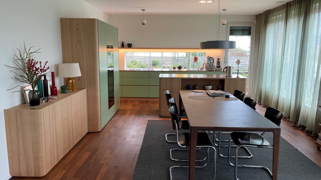 Cette cuisine exceptionnelle, réalisée par un menuisier, allie savoir-faire artisanal et design moderne. La combinaison du bois de châtaignier plaqué et de l’acier inoxydable haut de gamme confère à la cuisine chaleur et élégance. Les angles arrondis et l’aménagement intérieur sur mesure, qui allient à la perfection fonctionnalité et esthétique, sont particulièrement remarquables. En collaboration avec l’architecte d’intérieur Zangger, une cuisine bien pensée a été créée, qui s’intègre harmonieusement dans le design grâce à des poignées spécialement fraisées et un passage de câbles en acier inoxydable. L’îlot de cuisine et le cellier offrent des solutions de rangement intelligentes qui allient style et fonctionnalité. Le revêtement en acier chromé avec finition tourbillonnée apporte une touche de modernité, tandis que les appareils Miele et l’éclairage créatif font de cette cuisine une expérience réussie à tous points de vue.