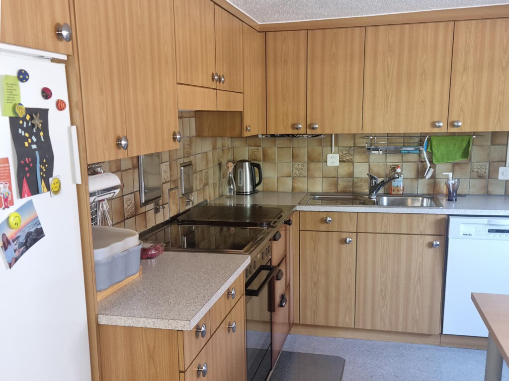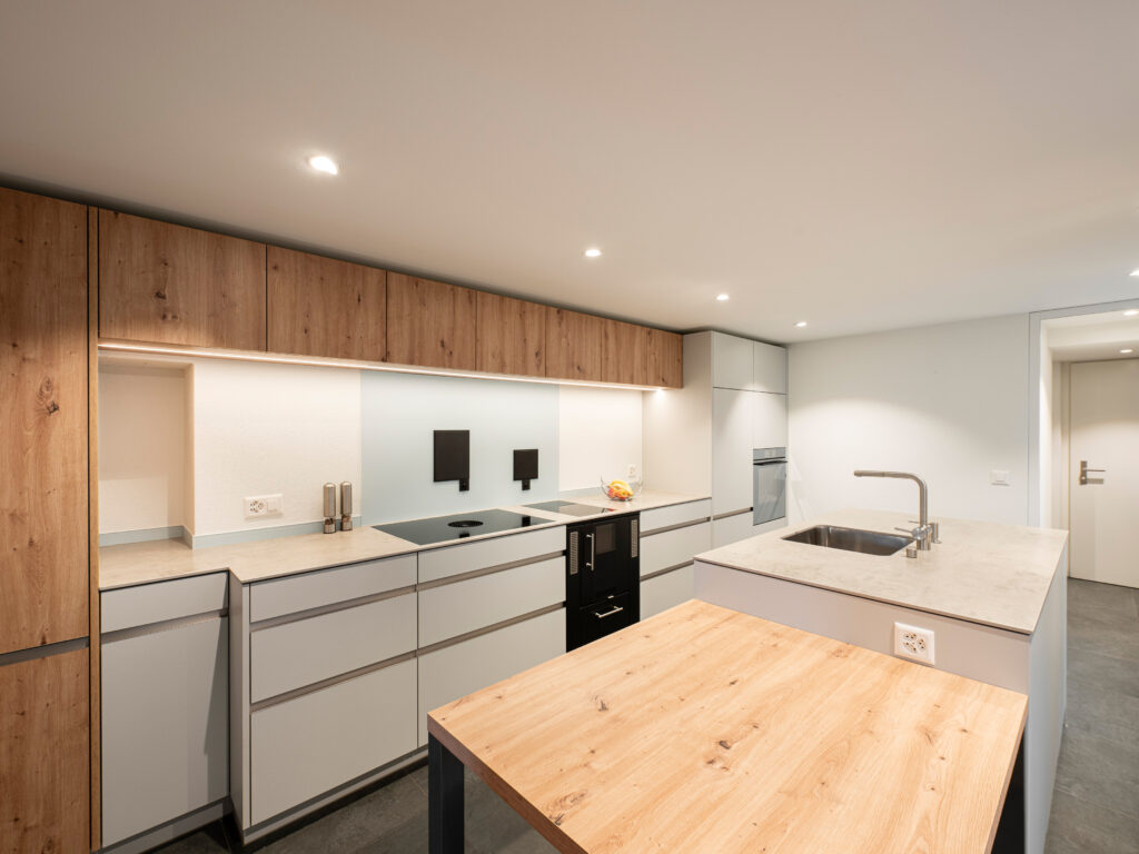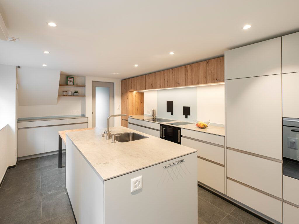 Un nouveau cœur pour une vieille maison Avec beaucoup de sensibilité, une cuisine qui honore l’ancien et accueille le nouveau a été créée dans une ferme du XIXe siècle. Le maître d’ouvrage souhaitait un espace lumineux et fonctionnel avec un îlot de cuisine moderne et des places assises pour 3 à 4 personnes, un petit coin café, un chauffage au sol et un design épuré, sans pour autant masquer le caractère historique du lieu. L’espace existant, une pièce d’environ 12 m² avec divers éléments fixes (mur coupe-feu existant, conduites, emplacement de la cuisinière Tiba, sous-face de l’escalier), a pu être agrandi à 15,5 m² en direction de l’ancienne buanderie. Les façades en bois chaleureuses contrastent avec le bleu de la paroi arrière en verre et un revêtement aspect béton. L’éclairage soigneusement étudié fait ressortir ces couleurs et confère à la pièce une atmosphère fraîche. Le chauffage au sol, techniquement sophistiqué au-dessus de la cave voûtée, apporte du confort sans altérer la substance du bâtiment. Le résultat est un nouveau centre de vie, conçu avec sensibilité et réalisé avec précision.
