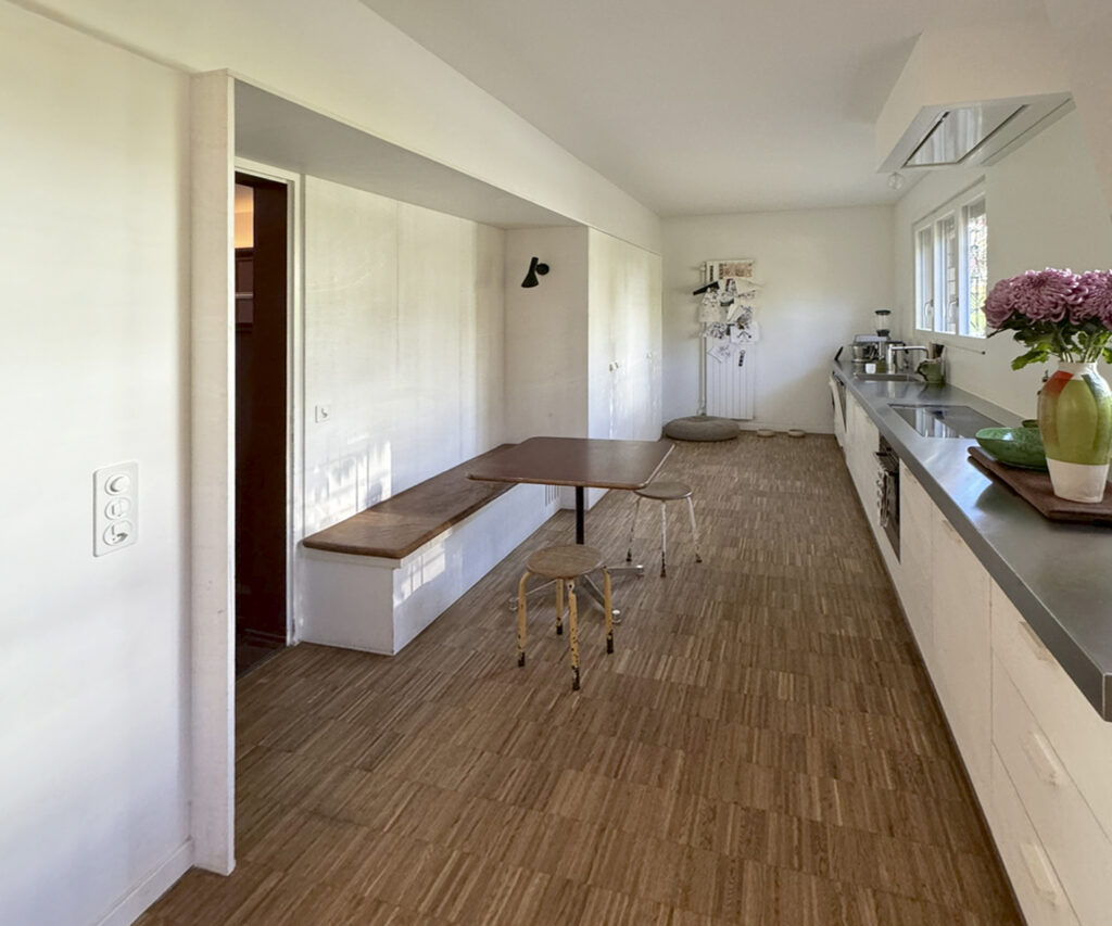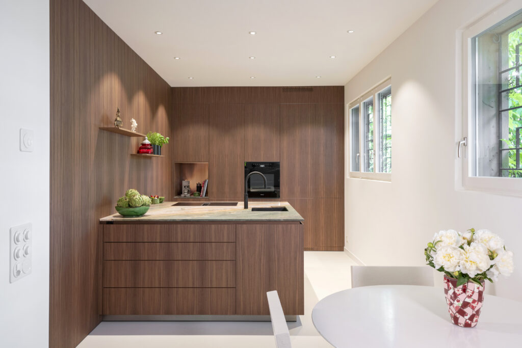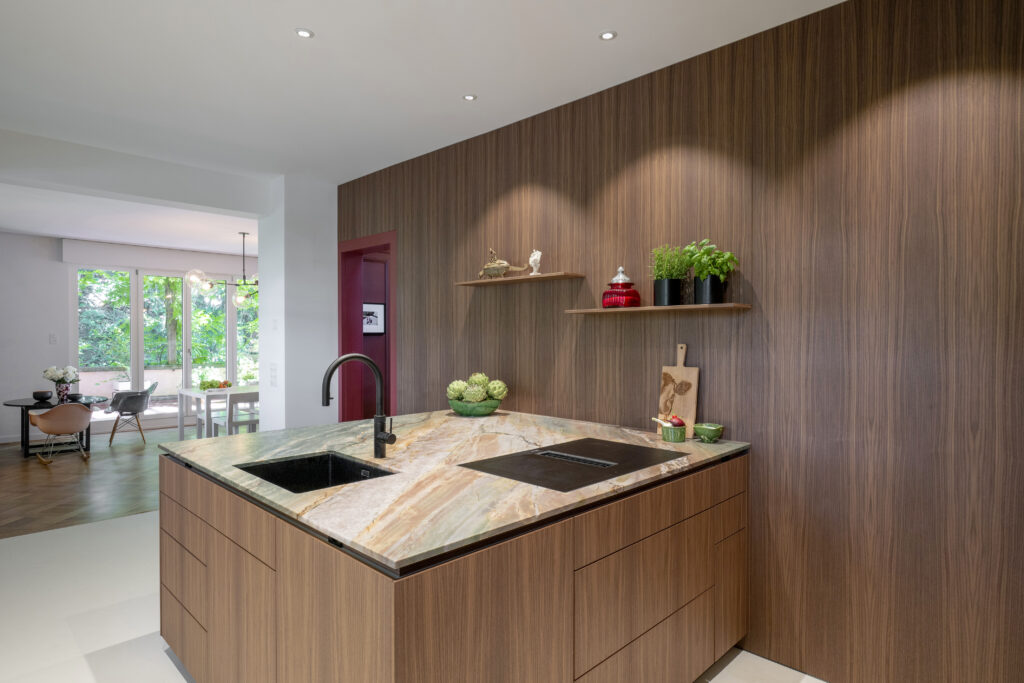 La pièce longue et étroite posait des exigences particulières en matière d’aménagement. En concertation avec le maître d’ouvrage, nous avons décidé de retirer les armoires hautes du mur gauche et de déplacer tous les éléments hauts vers le mur d’en face. La pièce s’ouvre ainsi et permet d’aménager un îlot carré spacieux qui combine cuisine, évier et communication. Le déplacement du lave-vaisselle sous le four a permis de gagner un espace de rangement supplémentaire dans l’îlot. Le mur en noyer sur toute la longueur confère à la cuisine profondeur et chaleur, tandis que le plan de travail en pierre claire rappelle une plage de sable : calme, naturel, accueillant.