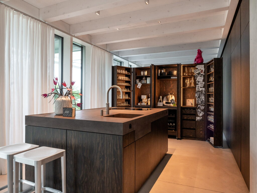 Kühle Klarheit trifft auf kraftvolle Materialität, eine Küche, die klare Formen mit sinnlicher Textur vereint. BASALTINA beeindruckt durch den kontrastreichen Dialog von rohem Lavastein und schwarzer Seekiefer, die zusammen eine reduzierte und zugleich eindrucksvolle Atmosphäre schaffen. Die fugenlose Oberfläche mit integriertem Becken aus gebürstetem Lavastein zeugt von handwerklicher Präzision und ästhetischer Klarheit. Der massive Lavablock formt eine kubische Silhouette und bringt markante Linien ins Gesamtbild. Aluminiumfronten am Kofferschrank setzen gezielte Akzente und erweitern das Materialspiel um eine leichte technische Note. Hinter den mit weichem Aluminium verkleideten Türen sind Funktionsgeräte wie Weinkühler oder Thermomix elegant verstaut. Modernste Gaggenau Geräte und der multifunktionale Quooker für kaltes, warmes und heißes Wasser unterstreichen den Anspruch an zeitgemässe Funktionalität.