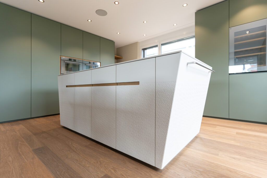 Die seitlich abgeschrägte Insel, inspiriert von der facettierten Form eines Diamanten, verbindet technische Innovation mit ästhetischer Präzision. Die im 400 °C-Ofen eingebrannte Pulverbeschichtung garantiert höchste Kratz- und Widerstandsfestigkeit, ist eco1-zertifiziert durch 97 % Pulverausnutzung und Emissionsfreiheit – ein klarer Vorteil gegenüber Nasslacken. Fugenlose Kanten und exakte Gehrungen schaffen eine monolithische Optik, die durch individuell gelaserte 3D-Laseroberflächen einzigartig akzentuiert werden. Ergonomisch gerundete, kratzfeste Griffmulden verbinden Funktion und Design. Elegant integrierte Drehknäufe des Induktionskochfelds unterstreichen die pragmatische Bedienung. Die pulverbeschichtete Insel in Weiss, salbeifarbene Schränke und Keramikabdeckungen schaffen ein zeitloses Zusammenspiel von Form und Funktion.