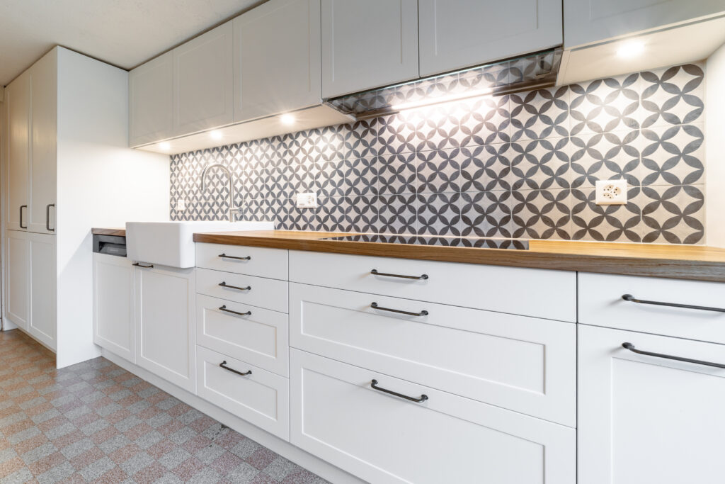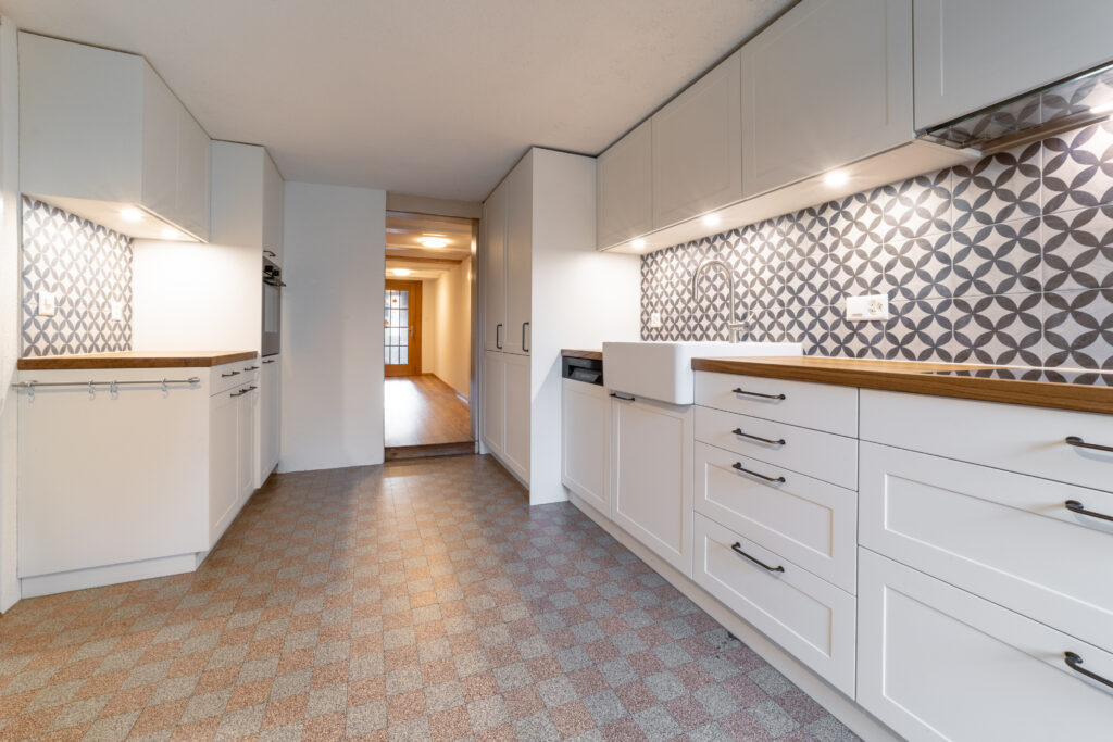 In einem charmanten Schulhaus im Herzen des Emmentals wurde eine stilvolle Landhausküche eingebaut, die Tradition und Moderne gekonnt vereint. Die weiß lackierten Fronten sorgen für eine helle, freundliche Atmosphäre und unterstreichen den klassischen Landhausstil. Ein besonderes Highlight ist das Aufsatzbecken aus edler Keramik, das mit seiner markanten Form einen Hauch Nostalgie vermittelt und zugleich höchste Funktionalität bietet. Die Abstellfläche aus massivem Eichenholz bringt Wärme und Natürlichkeit in den Raum und bildet einen harmonischen Kontrast zu den hellen Fronten. Die sorgfältig ausgewählten Materialien und die handwerklich hochwertige Ausführung machen diese Küche zu einem echten Blickfang und zugleich zu einem Ort des Zusammenkommens, des Genusses und der Gemütlichkeit – ganz im Sinne der ländlichen Lebensart des Emmentals.