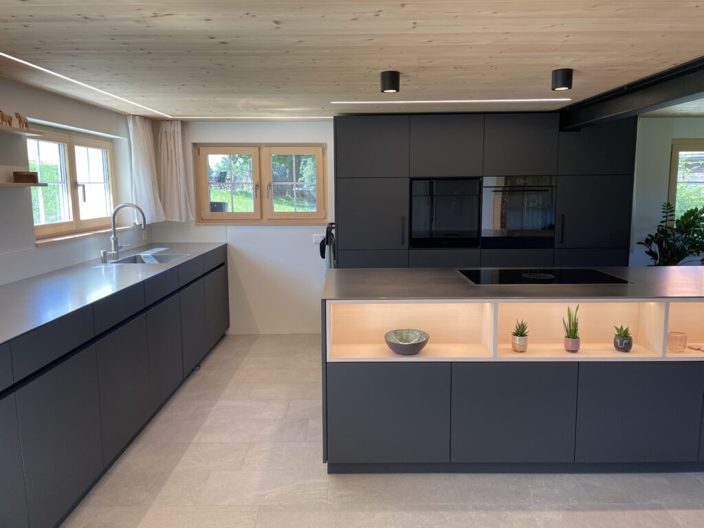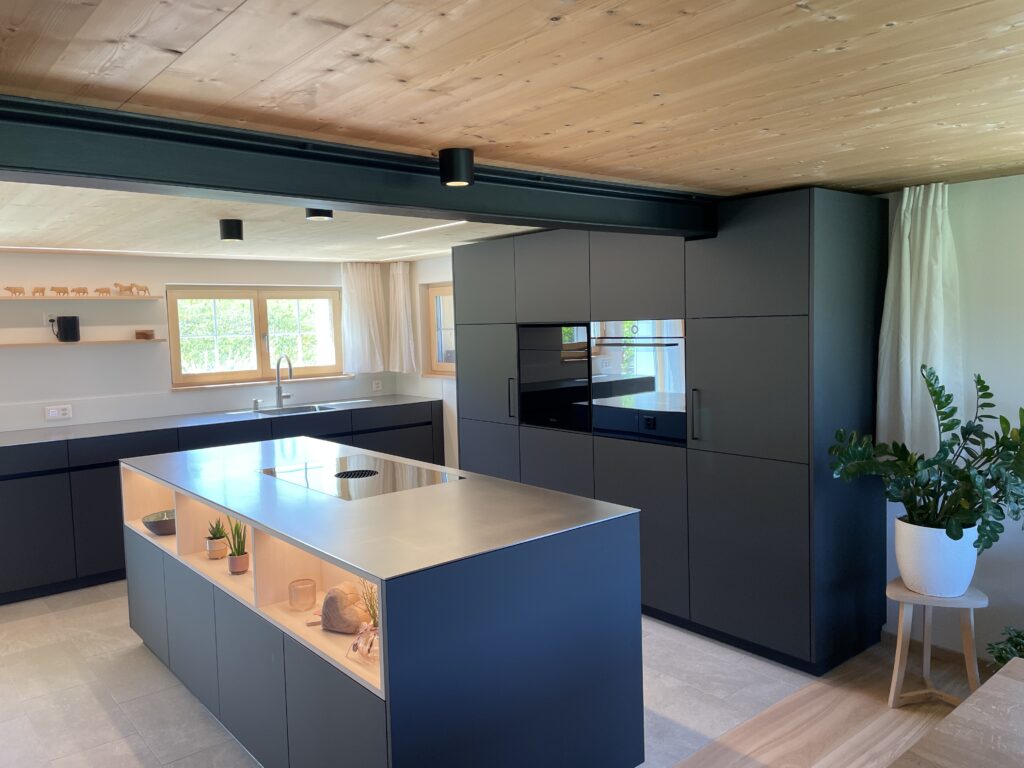 Ziel des Küchenumbaus, war eine geräumige Küche mit viel Abstellfläche und Stauraum zu verwirklichen. Die voraussetzung war eine Chromstahlabdeckung, wie gewisse Detials, die zum Wohlfühlen in der Küche einladen. Schlicht und modern, soll die Küche, das neue Raumkonzept des Bauernhauses ergänzen. Die Herausforderungen waren die geringe Raumhöhe, die integration des Eisenträgers zum Küchenkonzept, wie eine optimale einteilung für schnelle Wege.