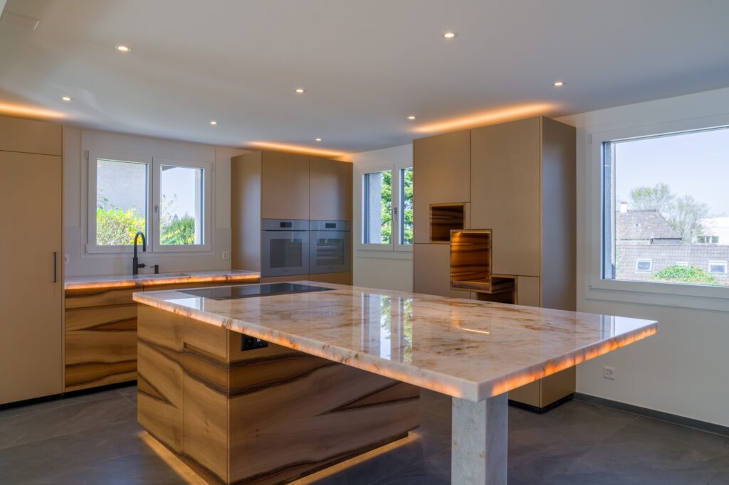 Luxuriös, lichtvoll, kompromisslos – diese Küche verkörpert das perfekte Zusammenspiel von Design und Alltagstauglichkeit. Die Kombination aus luxuriösen Materialien, eleganter Linienführung und lichtdurchfluteter Raumwirkung schafft eine exklusive Atmosphäre mit familiärem Flair. Ein Highlight: die massgefertigten Elemente aus unserer hauseigenen Schreinerei, welche höchste Präzision und Qualität garantieren, in Kombination mit den neuesten Gerätschaften. Eine besondere Herausforderung waren die vorgegebenen Platzverhältnisse und der Anspruch, die Küche harmonisch in die architektonische Sprache der Liegenschaft zu integrieren. Gefordert waren höchste handwerkliche Präzision und interdisziplinäre Zusammenarbeit. Das Ergebnis: eine Küche, die durch Ästhetik, Wertigkeit und Entschleunigung überzeugt – und durch jedes Detail eine Geschichte erzählt.